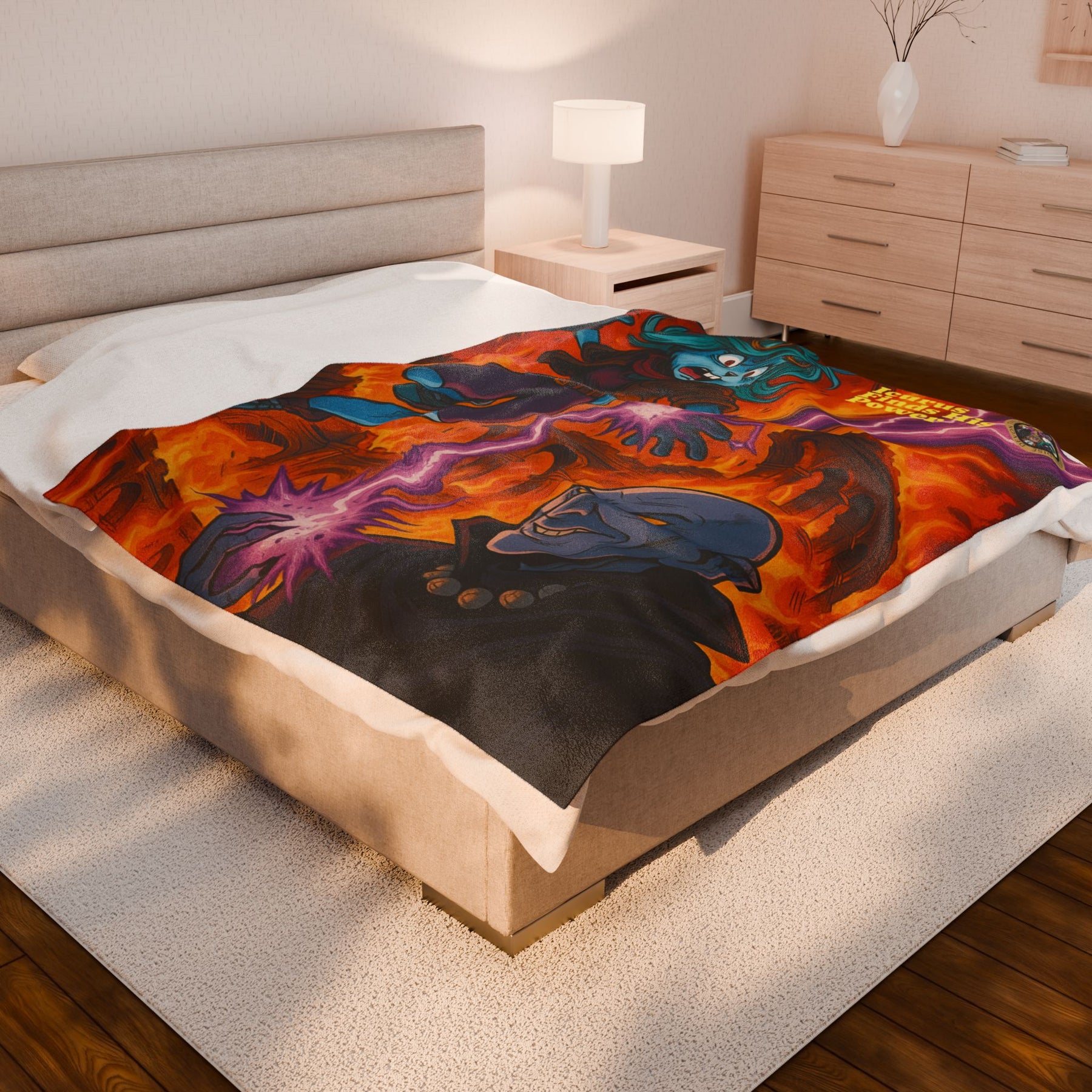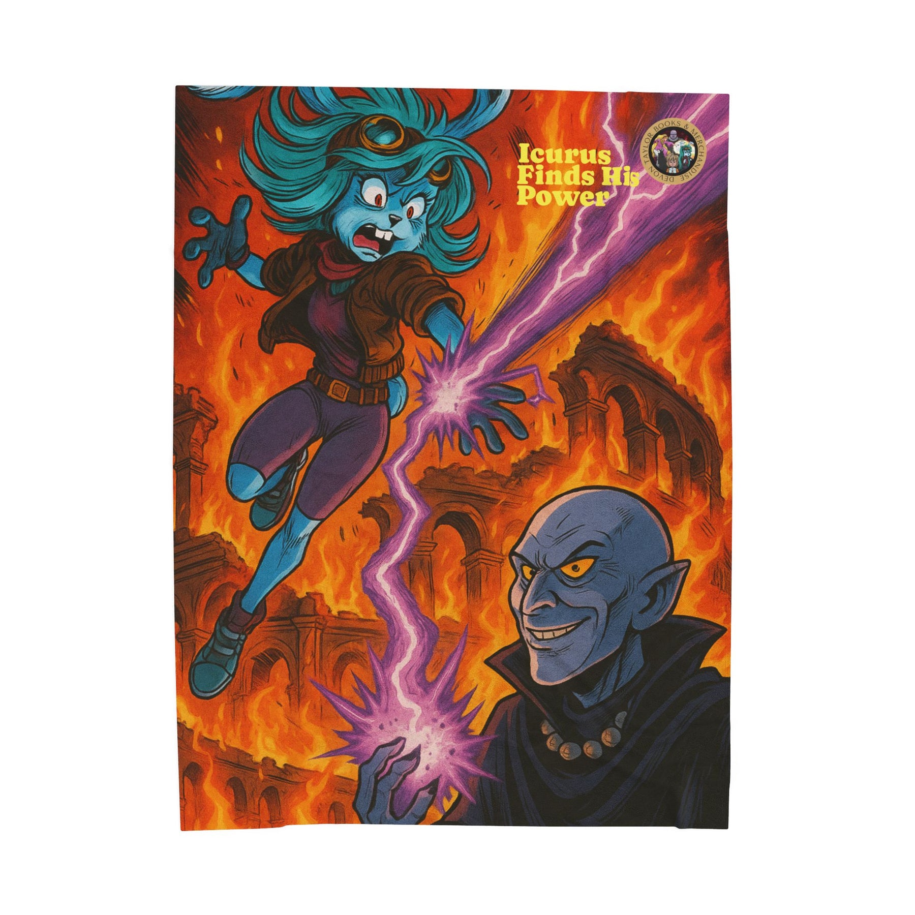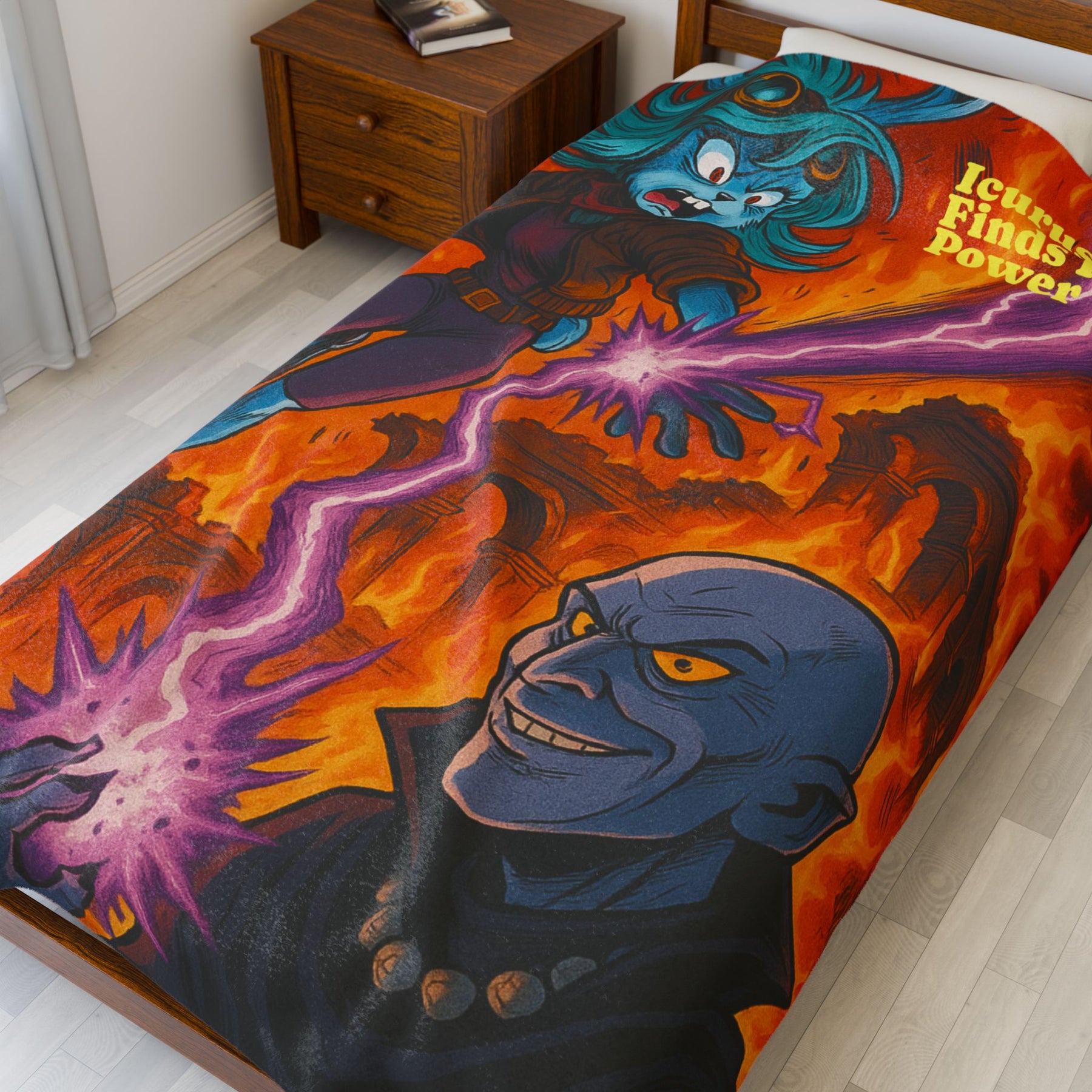 Wrap yourself in a story of bold color and cinematic adventure. This plush velveteen blanket features a vivid, single-sided print of an epic clash — electric energy arcs between a determined, teal-haired heroine and a sinister sorcerer set against molten, ruinous architecture. The fabric feels luxuriously soft and warm against the skin while the high-detail print keeps every flame and lightning strike crisp. Use it on late-night gaming sessions, comic-reading marathons, or to add a punch of illustrated drama to a cozy corner. It brings the intensity of the scene into your space and holds it there, bright and tactile.